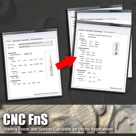 CNCFnS is a simple free program for calculating starting Feed and Speed data for *Vectric Application 3D Tool Databases (VCarve, Cut3d, and Aspire.)